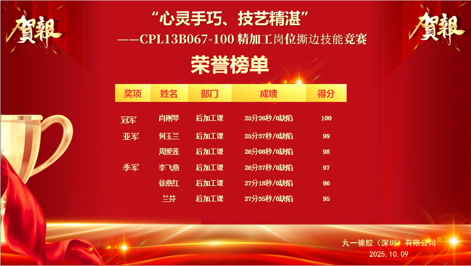9月25日下午,丸一橡胶(深圳)有限公司后加工车间内气氛紧张而热烈,一场以“心灵手巧、技艺精湛”为主题的精加工岗位撕边技能竞赛正在这里火热进行。30名来自不同班组的员工齐聚一堂,以技会友,以质争先,展开了一场速度与精度的精彩对决!